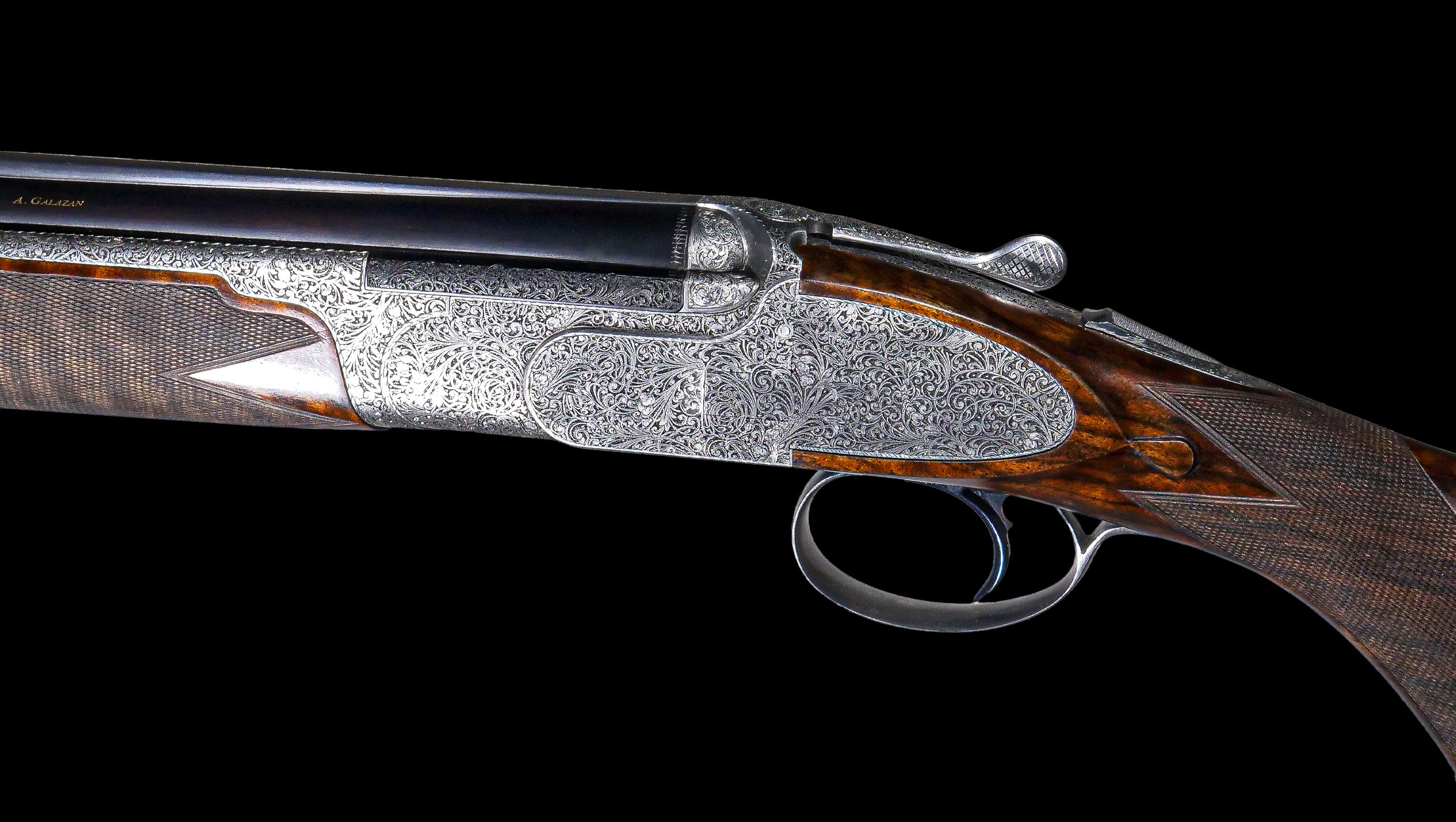 This mechanical excellence and meticulous craftsmanship make the A. Galazan over & under shotgun worthy of the description "best gun." Yet it is in the final finishing and custom engraving that this gun surpasses any in the world. Typical of the guns built as of this writing are those with fine rose and scroll. A. Galazan full sidelock over & under shotguns are built strictly to customer order. All guns are priced individually, per the customers requirements.