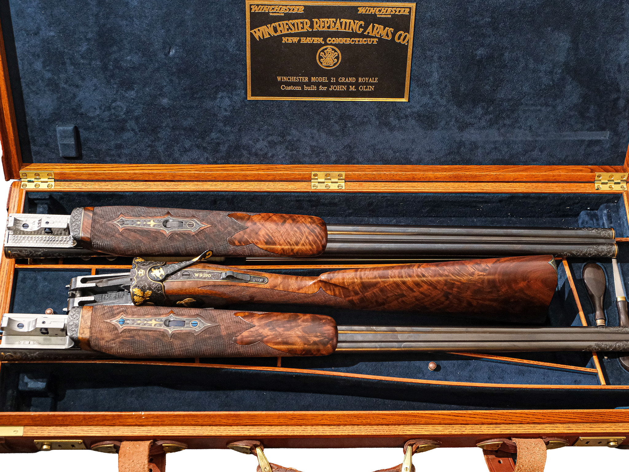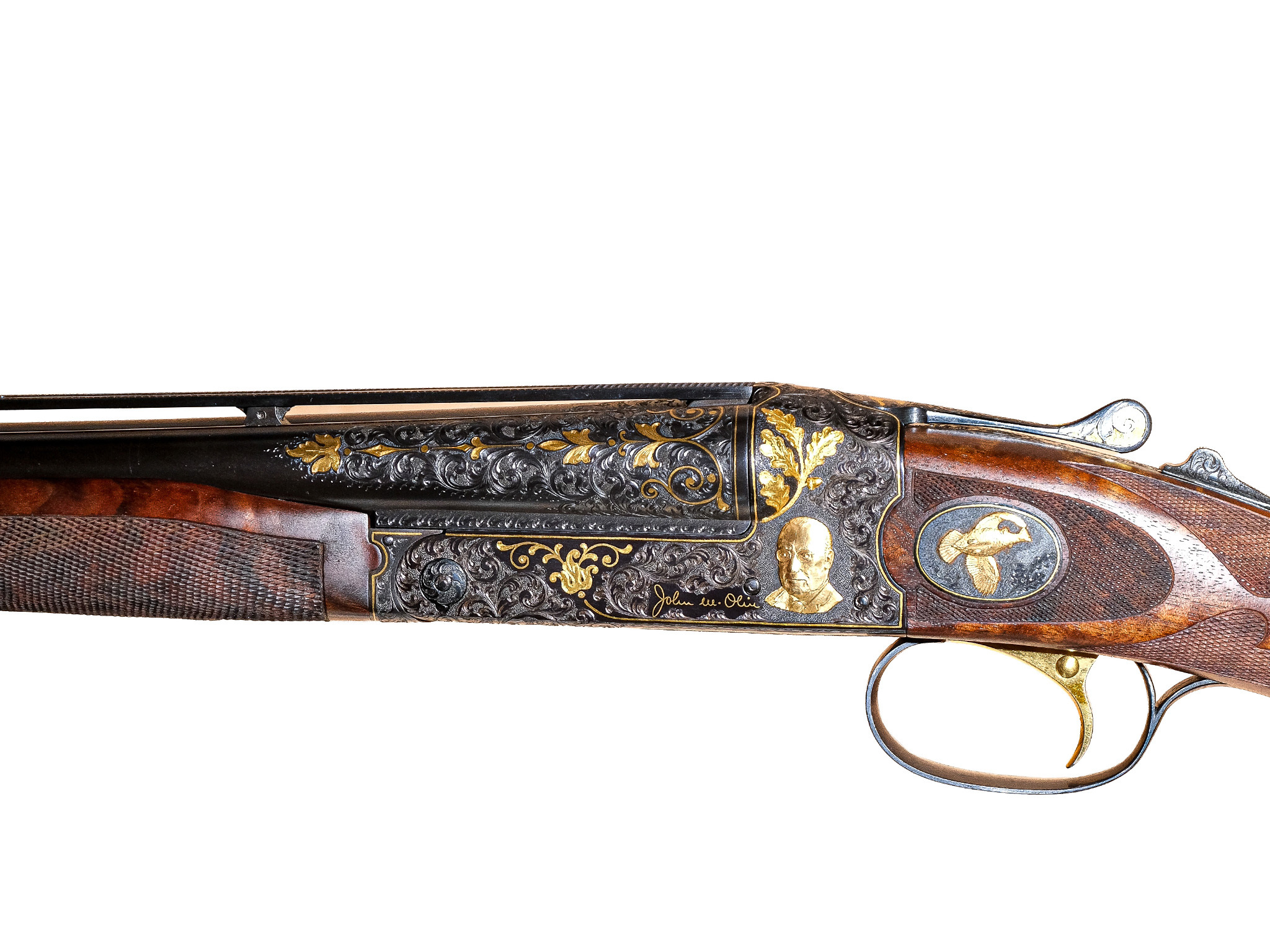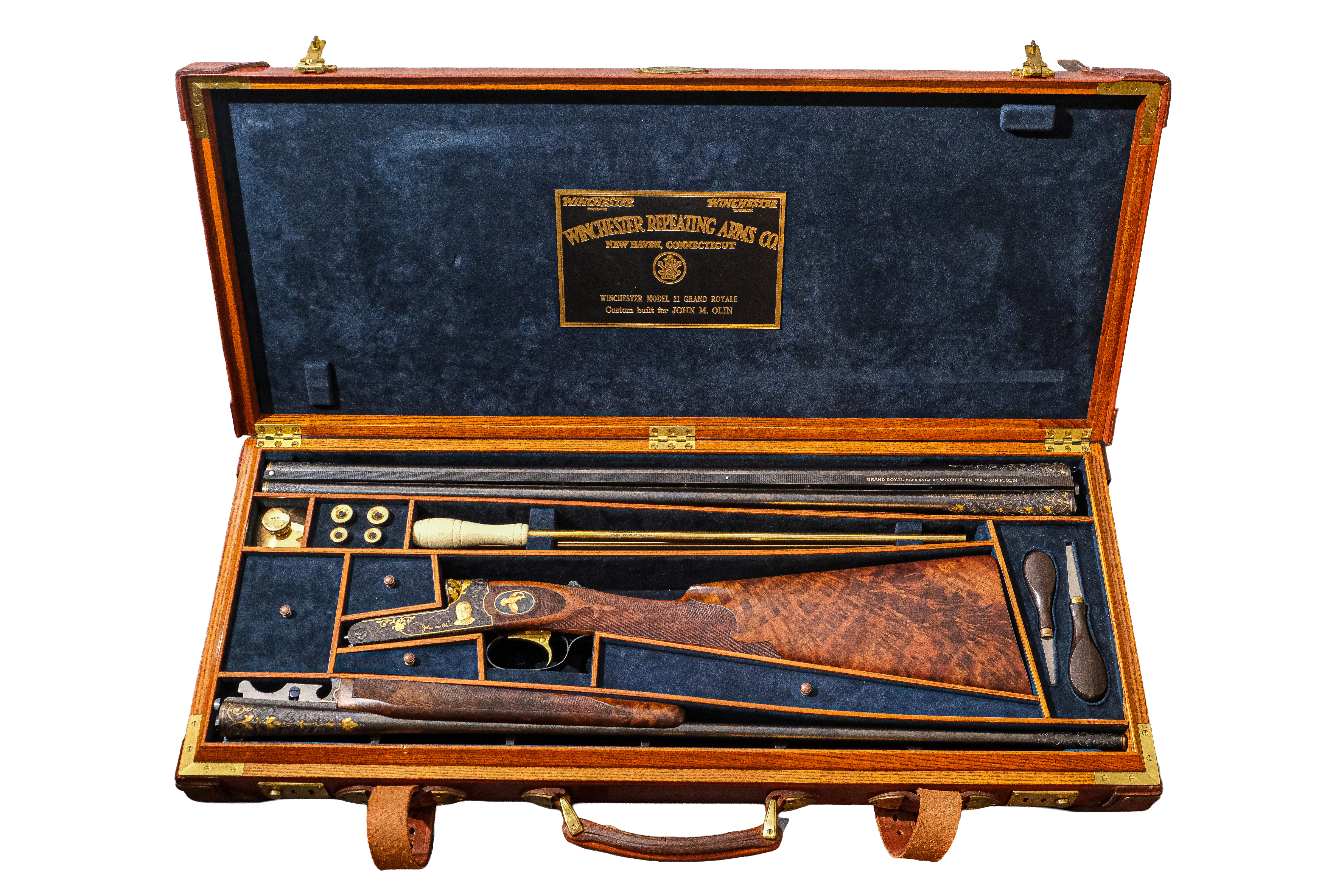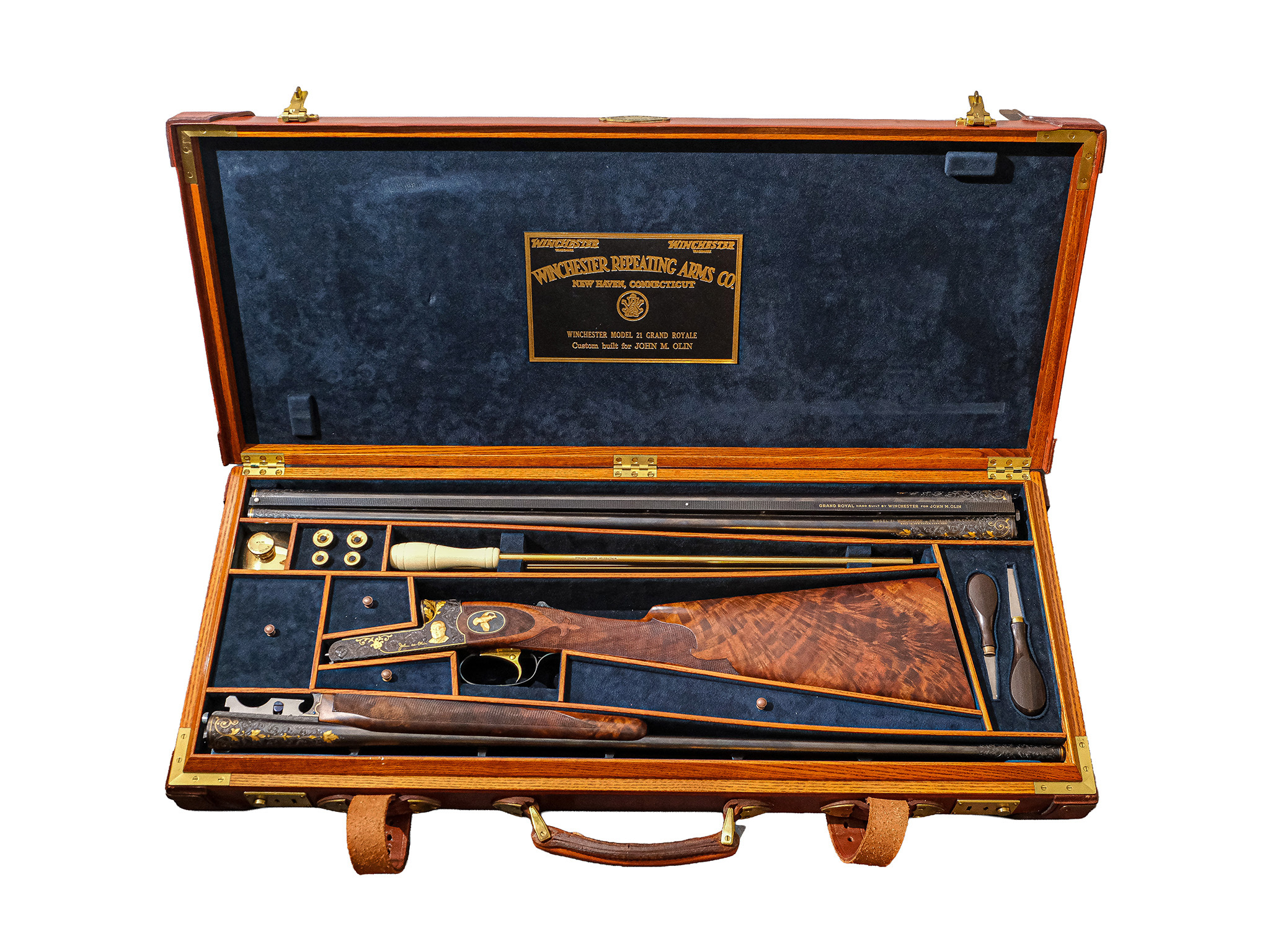Additionally, on the checkered side panels are ovals with deep-relief, gold-inlaid grouse in flight on the left and a deep-relief, gold-inlaid duck on the right, and the mating area of the frame has been cut out to complement the engraved side-panel ovals. The gun also has a fitted Huey case with all the accouterments in gold, and a Winchester label describing it as a Winchester Model 21 Grand Royale, custom-built for John M. Olin.