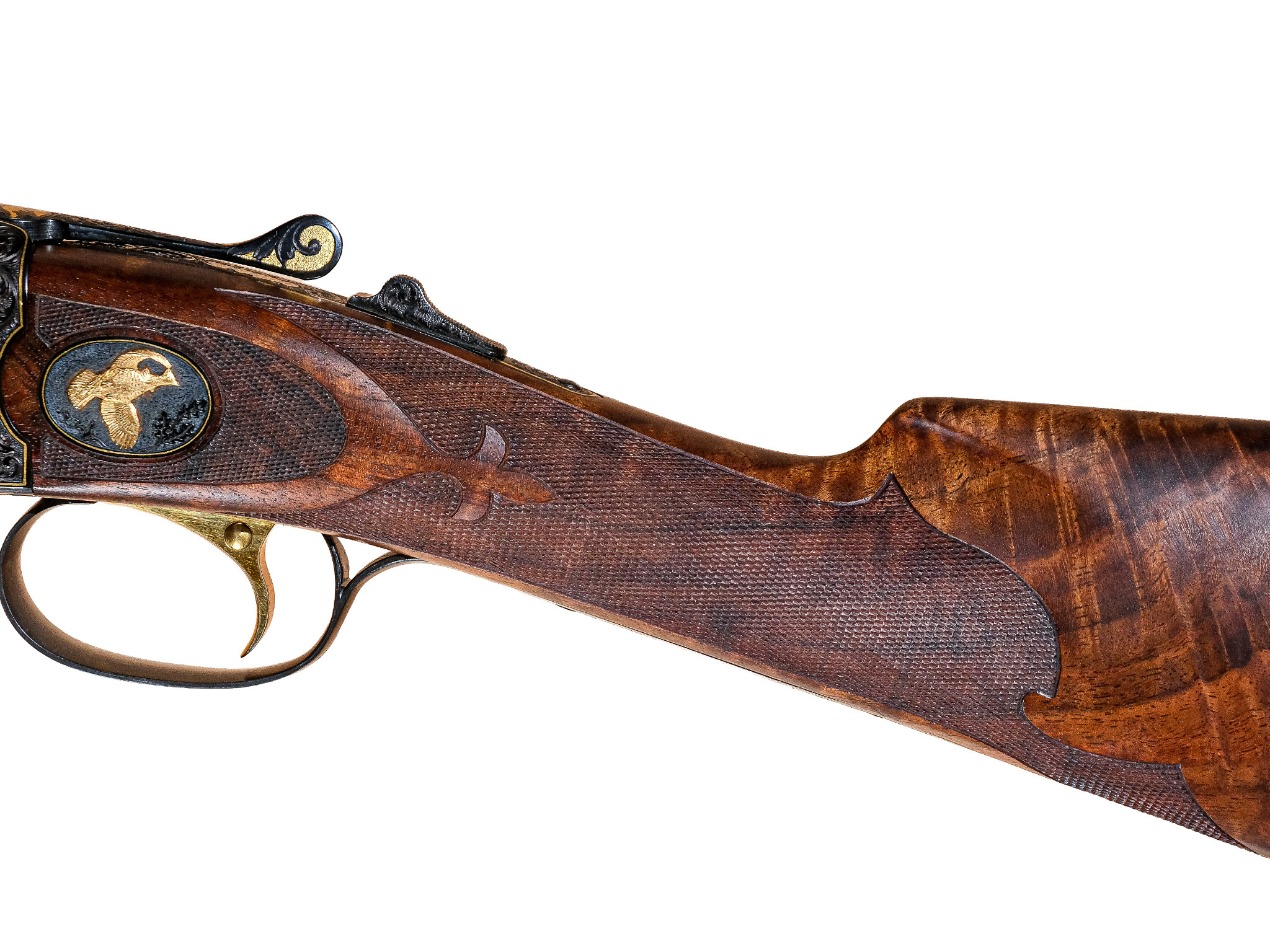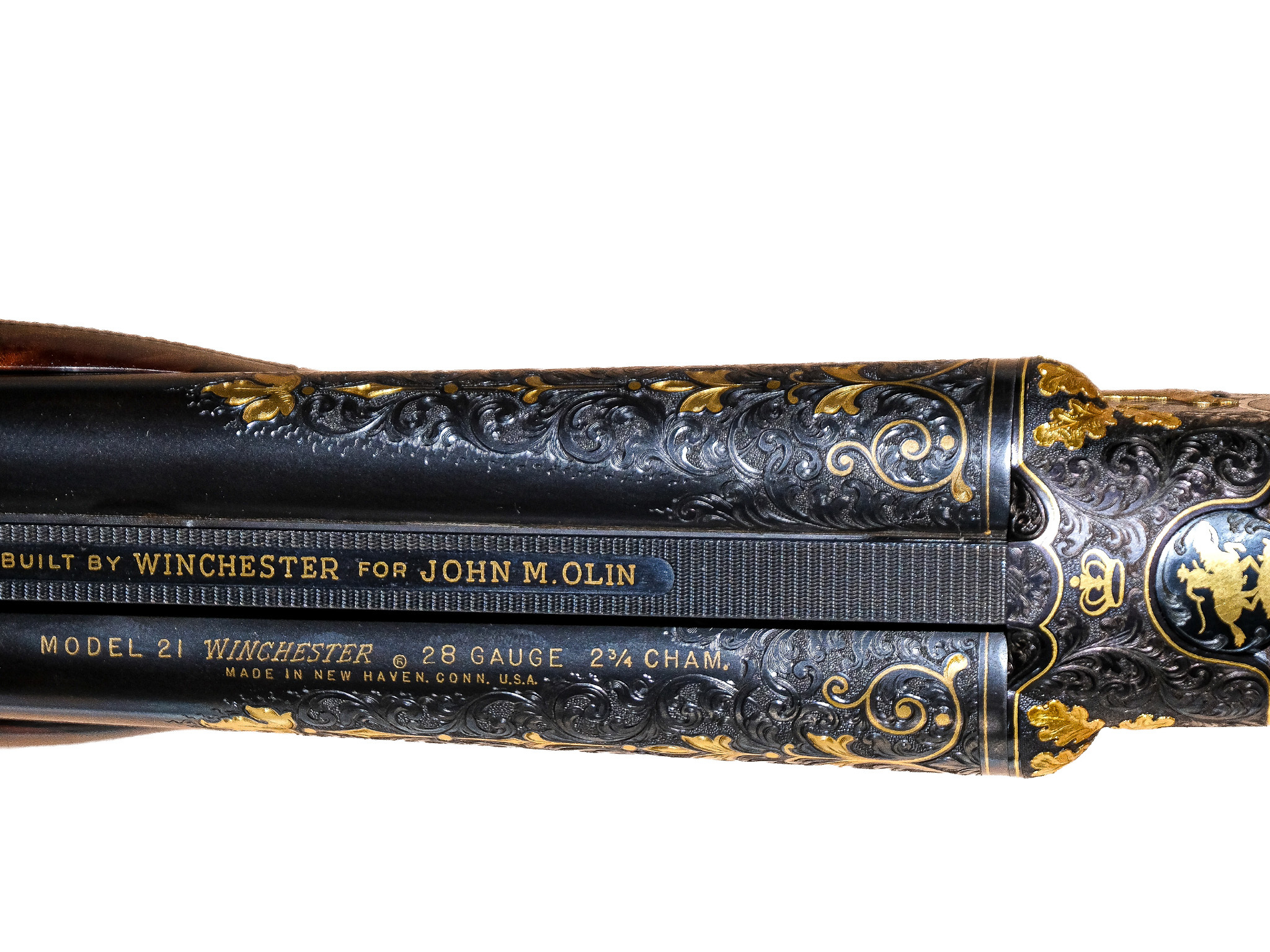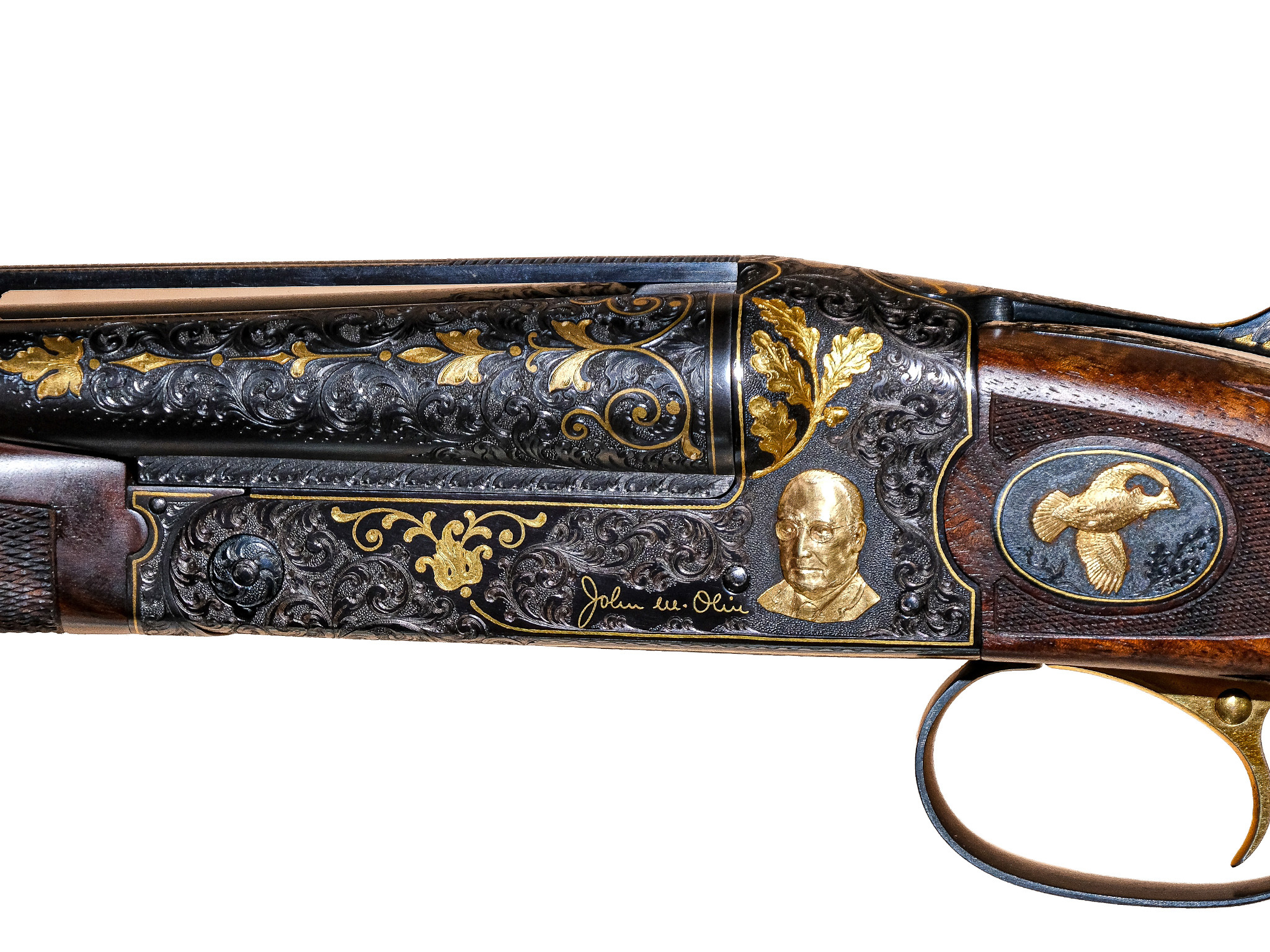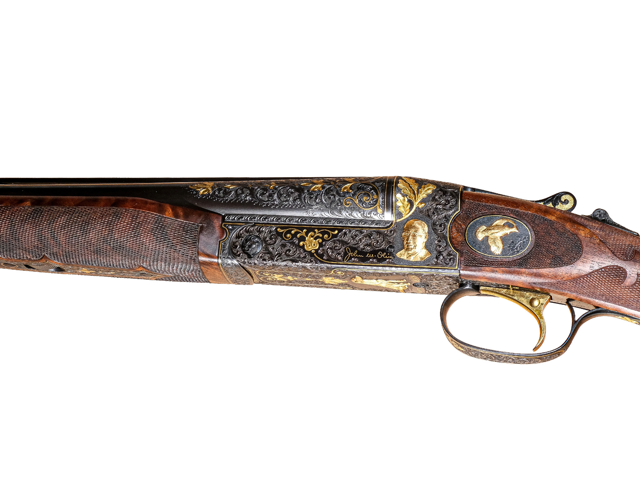 Additionally, on the checkered side panels are ovals with deep-relief, gold-inlaid grouse in flight on the left and a deep-relief, gold-inlaid duck on the right, and the mating area of the frame has been cut out to complement the engraved side-panel ovals. The gun also has a fitted Huey case with all the accouterments in gold, and a Winchester label describing it as a Winchester Model 21 Grand Royale, custom-built for John M. Olin.