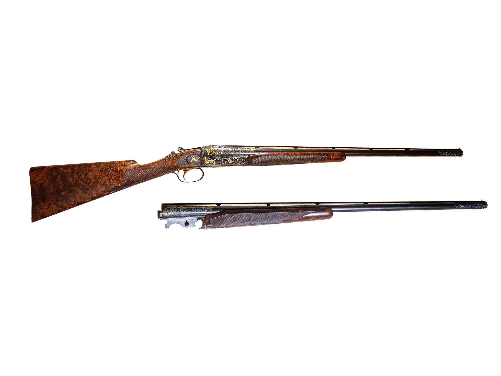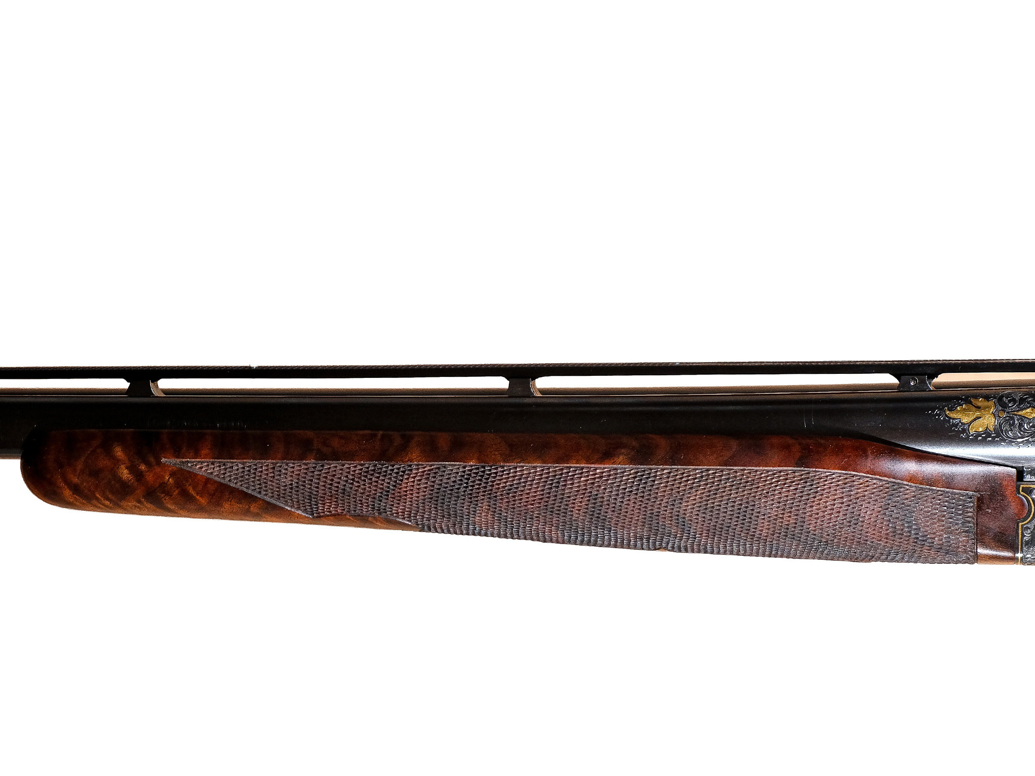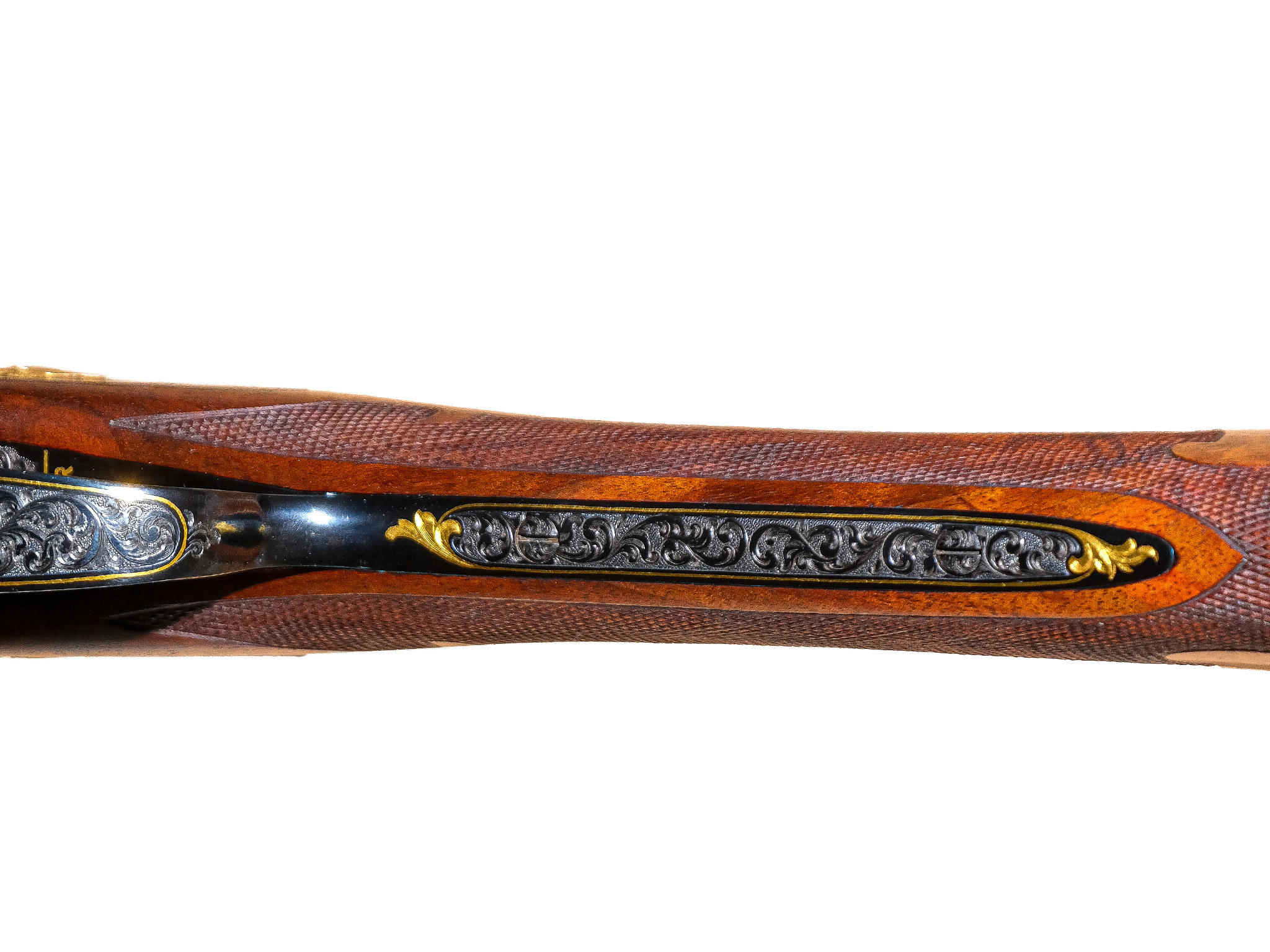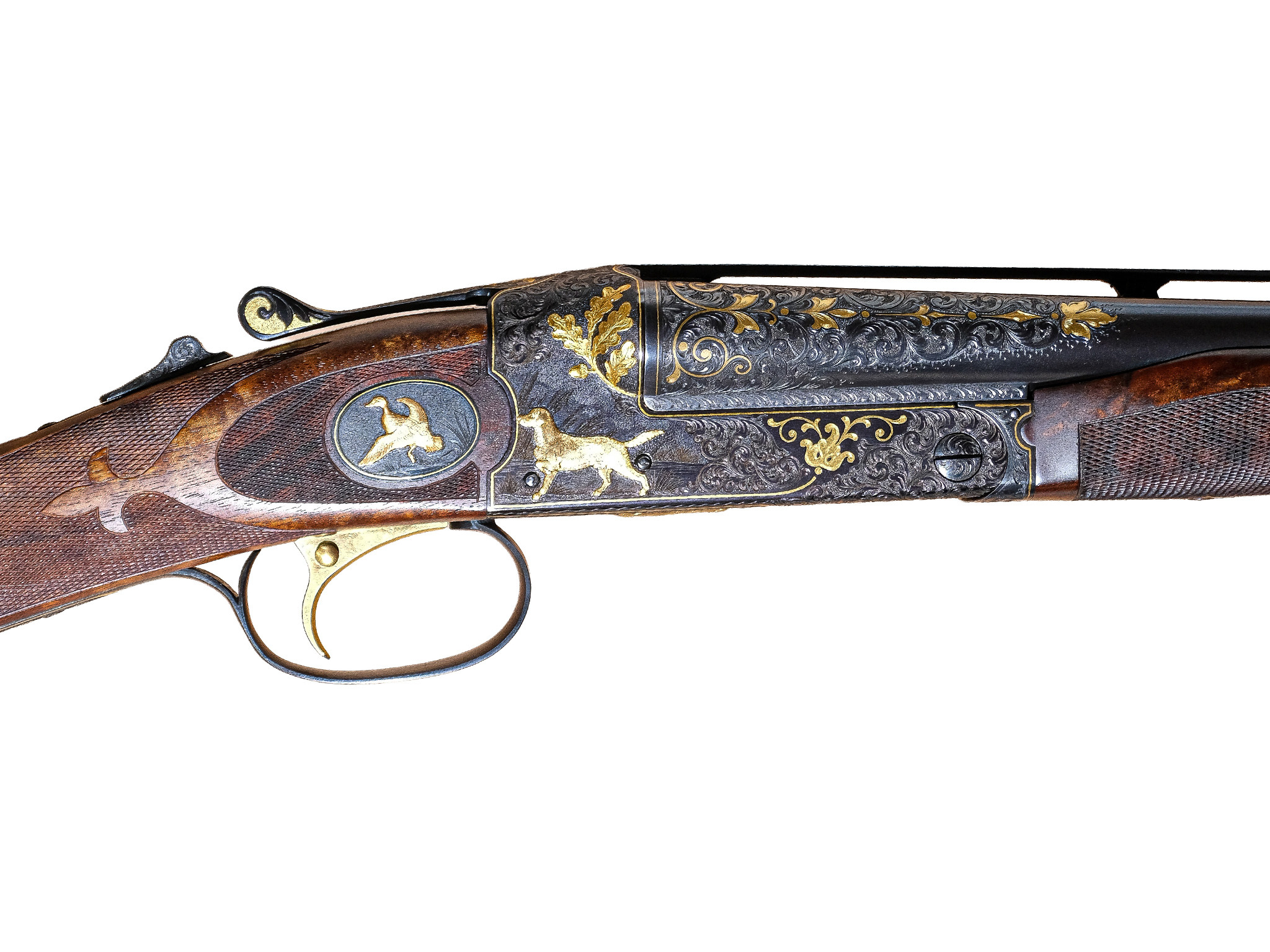 Additionally, on the checkered side panels are ovals with deep-relief, gold-inlaid grouse in flight on the left and a deep-relief, gold-inlaid duck on the right, and the mating area of the frame has been cut out to complement the engraved side-panel ovals. The gun also has a fitted Huey case with all the accouterments in gold, and a Winchester label describing it as a Winchester Model 21 Grand Royale, custom-built for John M. Olin.