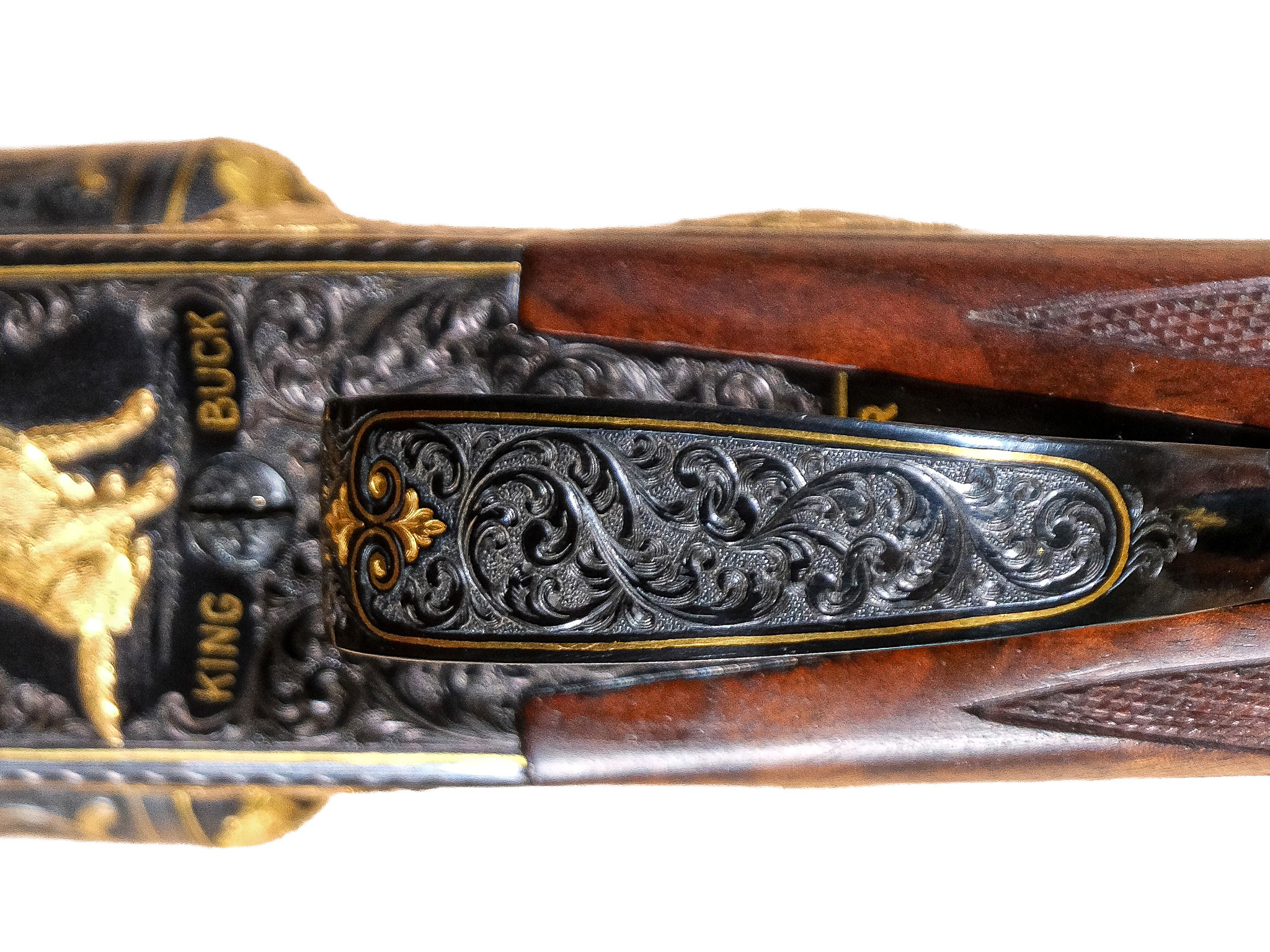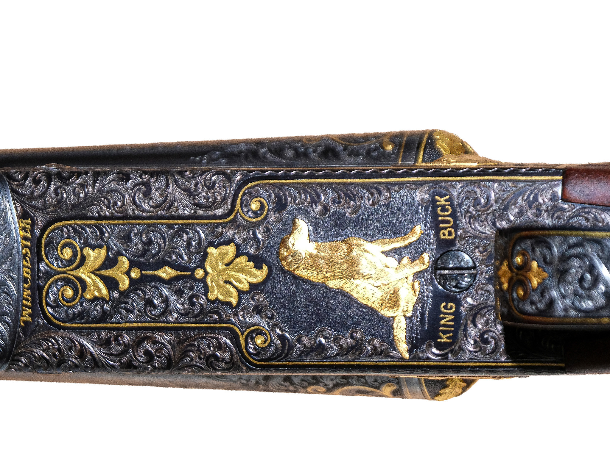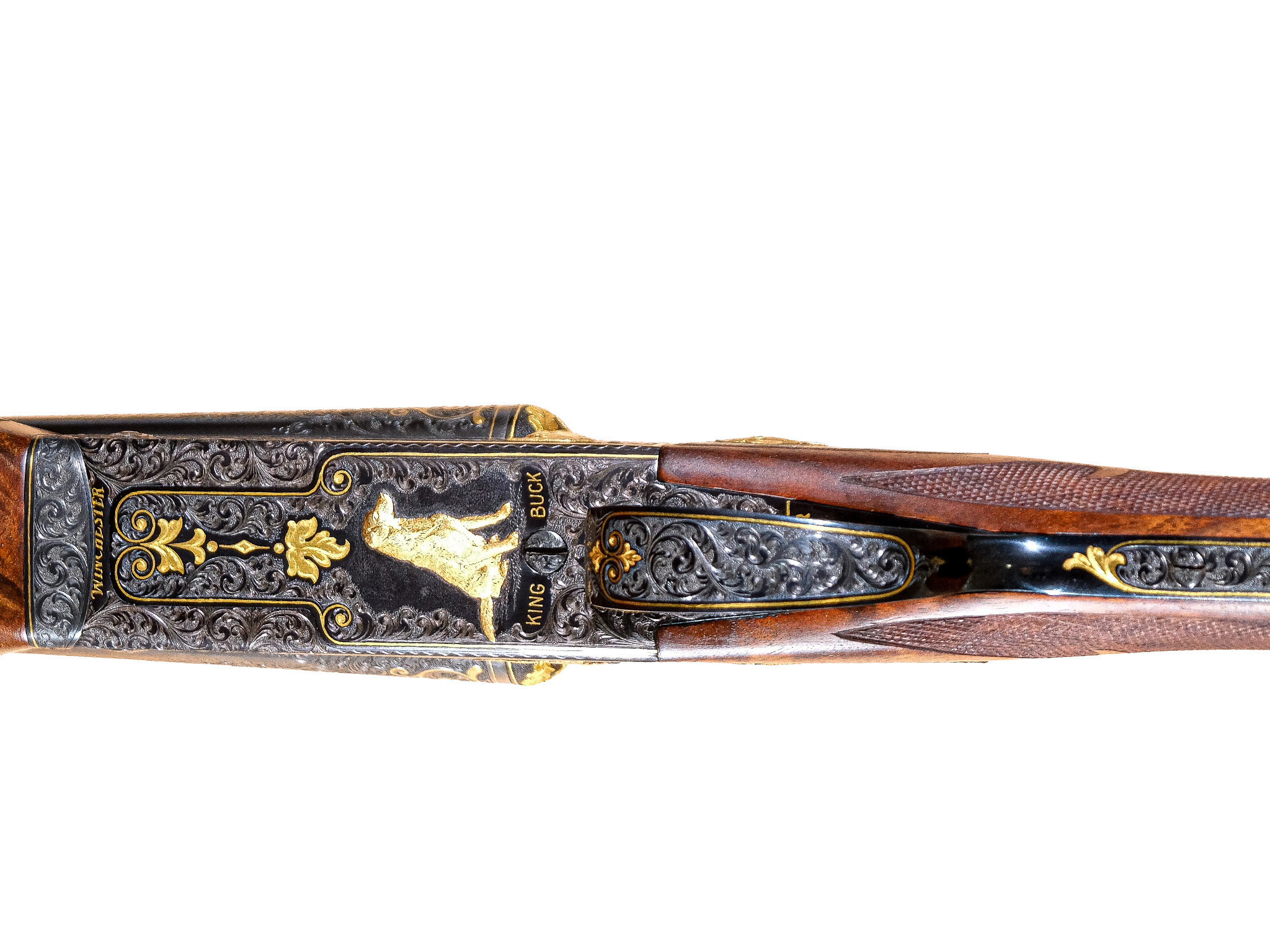 The engraving on this Grand Royal is like no other Winchester Model 21 you will ever see. The left side has a high-relief bust of him with his signature in gold; the right side has a gold setter in high relief; the bottom has King Buck in high relief, with King Buck inscribed in gold. The toplever has the Winchester horseman in gold. Winchester is also engraved in gold on the bottom of the frame. The entire frame is covered in classic American scroll engraving with fine gold linework, complemented by highly detailed ornamental gold engraving. The fence additionally features high-relief gold acanthus leaves. The trigger guard, forend iron, and unusually sculpted forend catch plates have engraving matching the engraving on the frame. The muzzles of the barrels feature gold double-line wedding bands that extend 3” long engraved wedges. These wedges are complemented by 4” long wedges on the muzzles with gold line work to match the corresponding area of the frame.